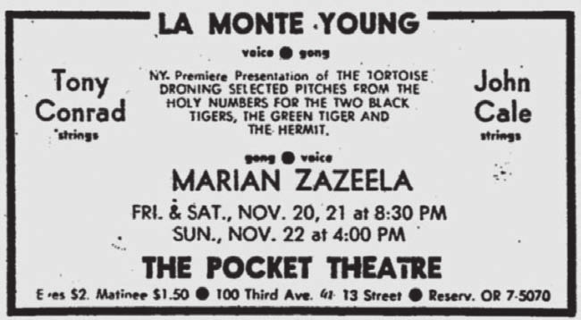 The composition The Tortoise, His Dreams and Journeys is performed by the Theatre of Eternal Music in Philadelphia, Pittsburgh and New York in 1964 and 1965.